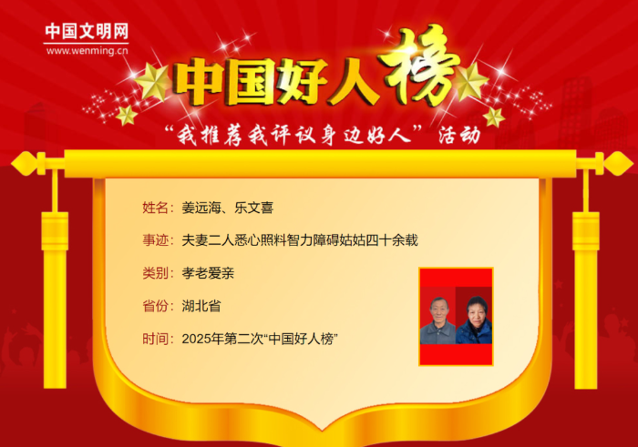 姜遠海、樂文喜:夫妻二人悉心照料智力障礙姑姑四十余載(十堰市)